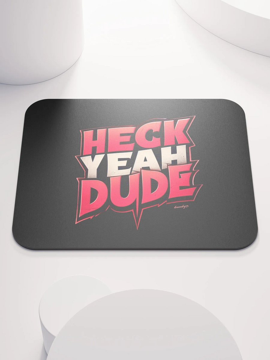Add a pop of personality to your workspace with our Classic Mouse Pad featuring the bold, stylized phrase 'HECK YEAH DUDE' in red and white on a black background. Made of soft polyester with a natural rubber base, it's perfect for work or home office use.